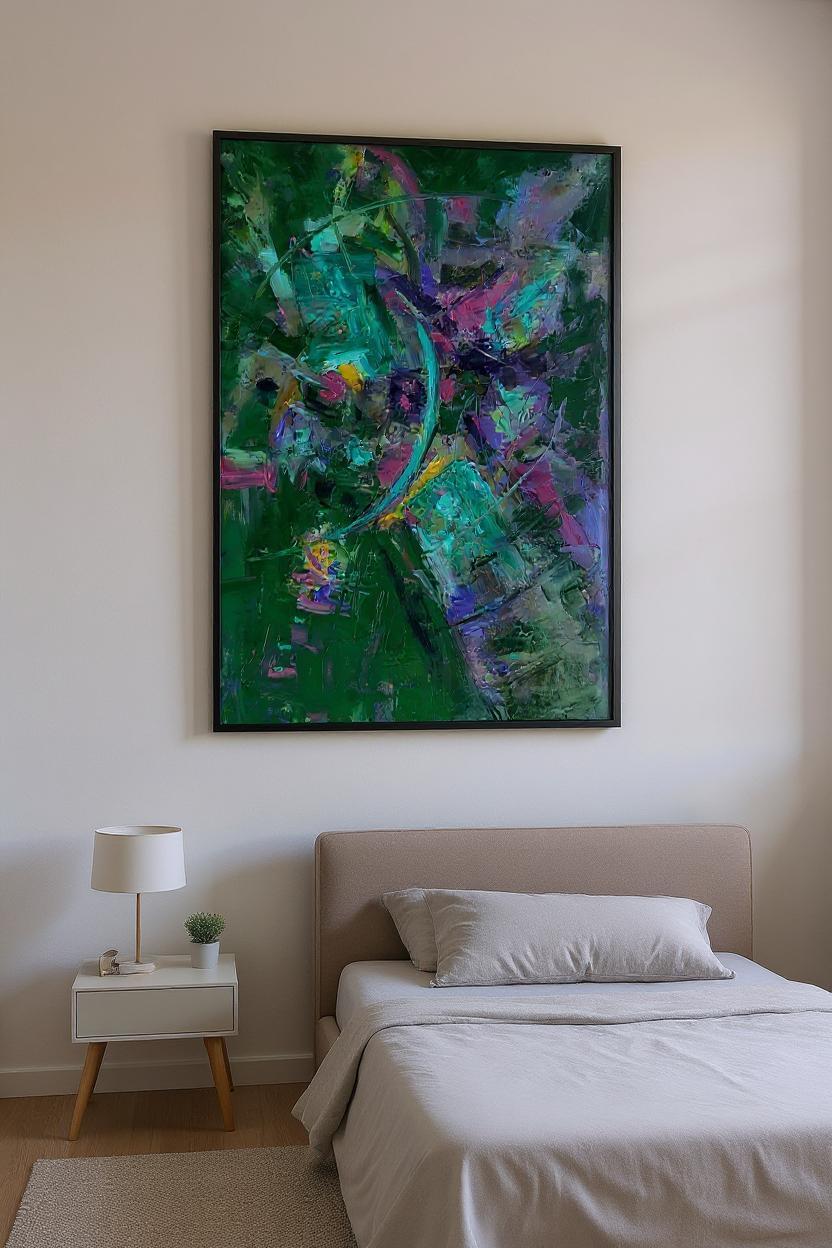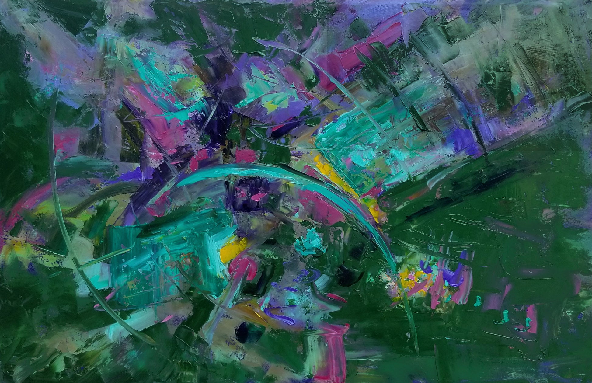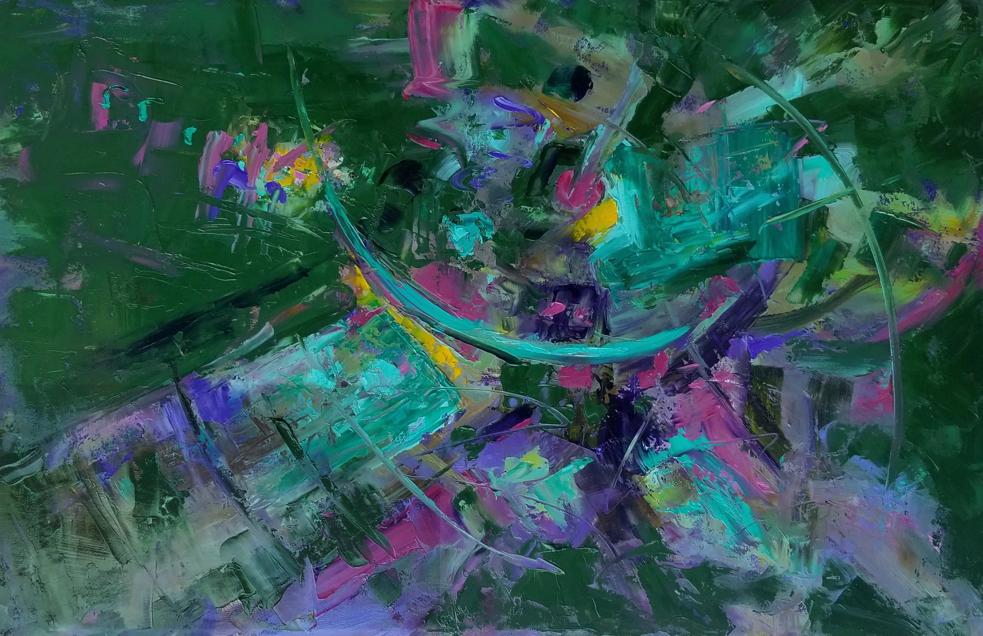 Chromoverde unfolds as a vibrant tension of color and movement, where lush greens pulse with life against the charged intensity of pinks and turquoise. Swirling and layered, the brushstrokes weave together in a rhythm both chaotic and deliberate, inviting the gaze to follow the sweeping arc that slices through the composition like a whispered secret or a fleeting breath. Amidst the dynamic surface, hints of yellow and purple emerge like subtle specters, shimmering beneath the turbulence of shape and shade.