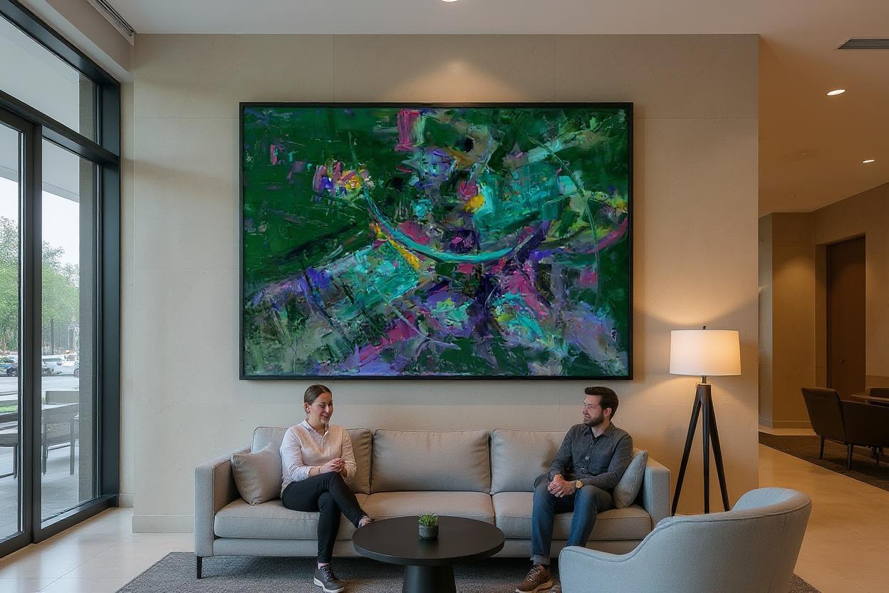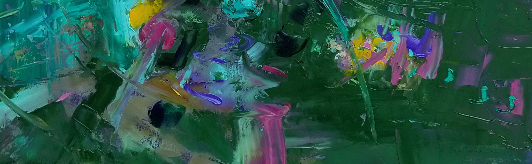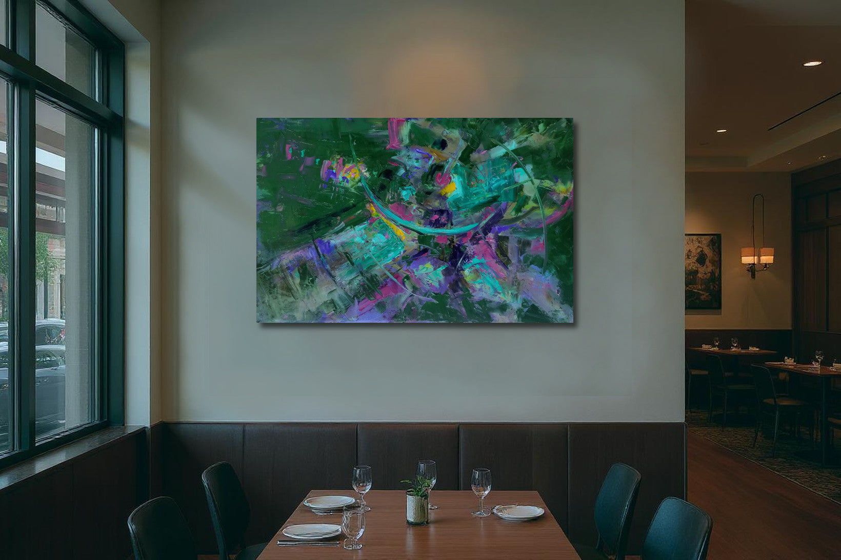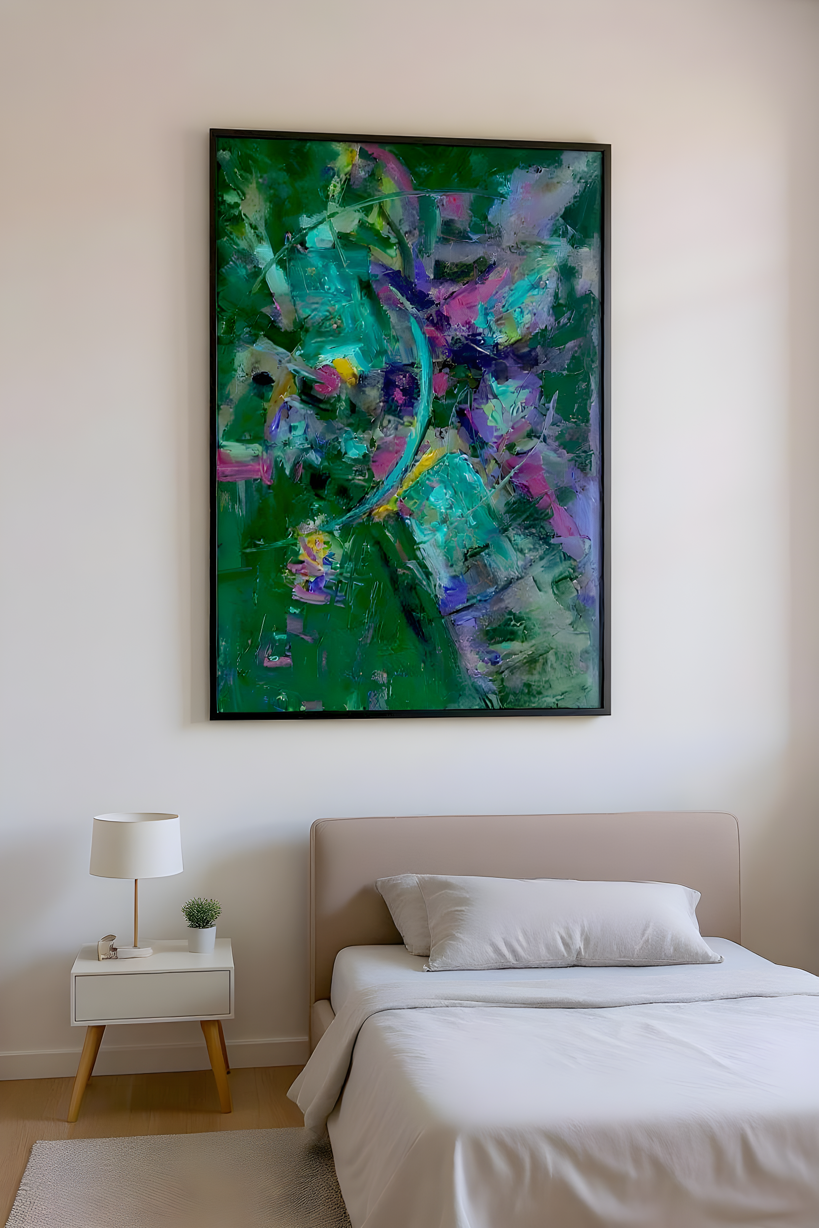 Chromoverde unfolds as a vibrant tension of color and movement, where lush greens pulse with life against the charged intensity of pinks and turquoise. Swirling and layered, the brushstrokes weave together in a rhythm both chaotic and deliberate, inviting the gaze to follow the sweeping arc that slices through the composition like a whispered secret or a fleeting breath. Amidst the dynamic surface, hints of yellow and purple emerge like subtle specters, shimmering beneath the turbulence of shape and shade.