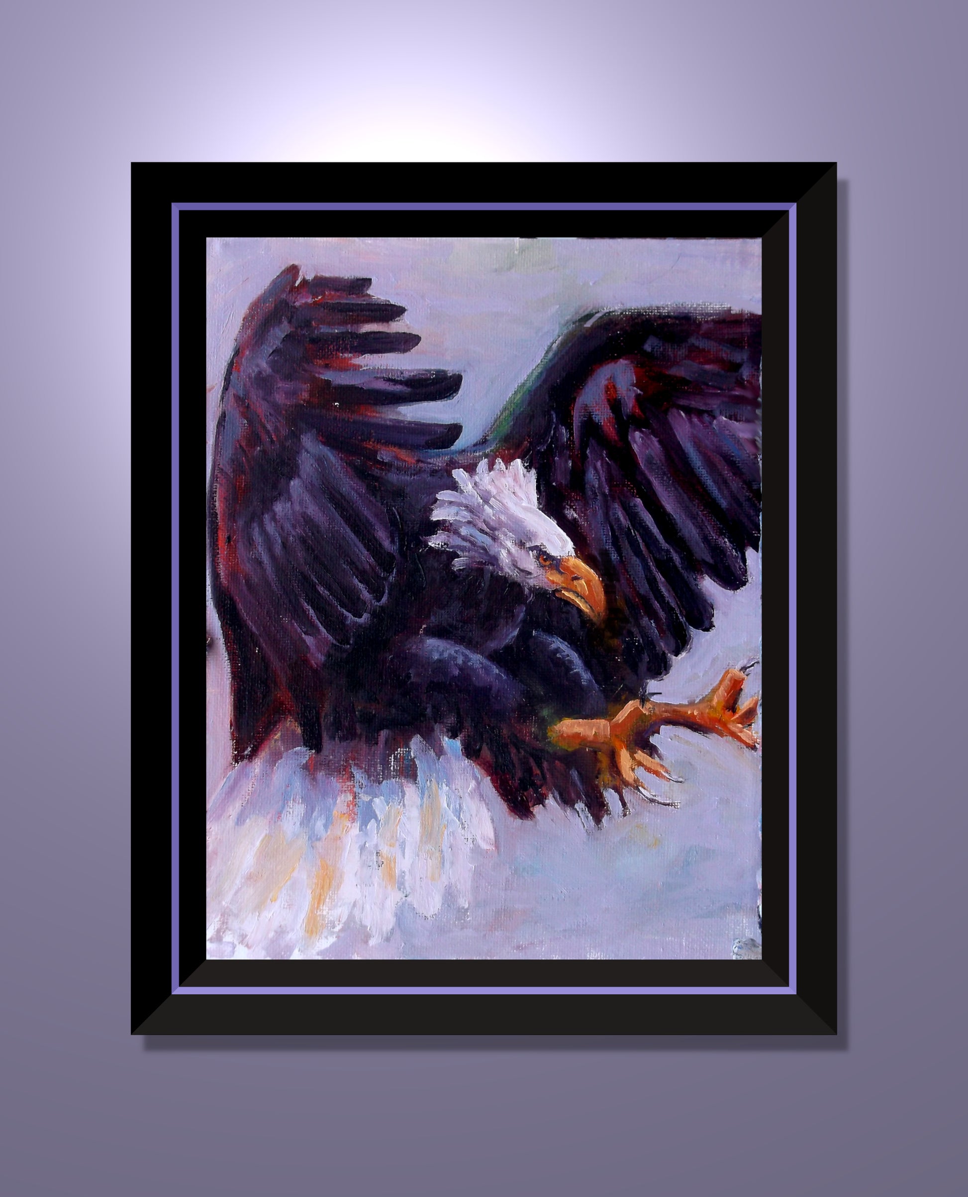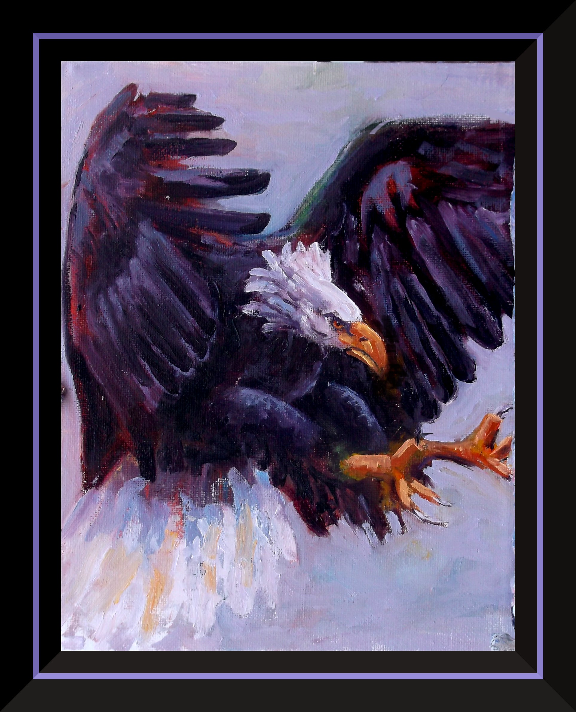 Meet “Fierce Wing,” my latest little powerhouse—just 8 by 10 inches but bursting with attitude. This bald eagle is mid-flight and ready to own the sky. I went all in with bold brushstrokes and rich, dark feathers tinged with hints of purple and red to give him that serious edge. His white head and sharp yellow beak lock eyes with you like he means business, and those extended talons? Let’s just say he’s not here to play nice. Painted alla prima, the whole thing came together in one energetic burst, making this fierce bird feel alive and full of motion against a soft, light background that lets him steal the spotlight. Sometimes, all you need is a whole lot of eagle energy packed into a small canvas.