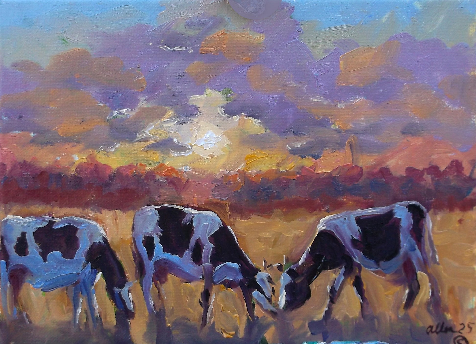 Twilight Pasture captures a quiet moment at sunset, where three cows graze on golden-brown grass beneath a sky alive with swirling purples, oranges, and yellows. The warm glow filtering through the clouds creates a peaceful, rural atmosphere that invites reflection on nature’s calm rhythms. The interplay of light and shadow on the cows emphasizes their form and presence within this tranquil landscape.