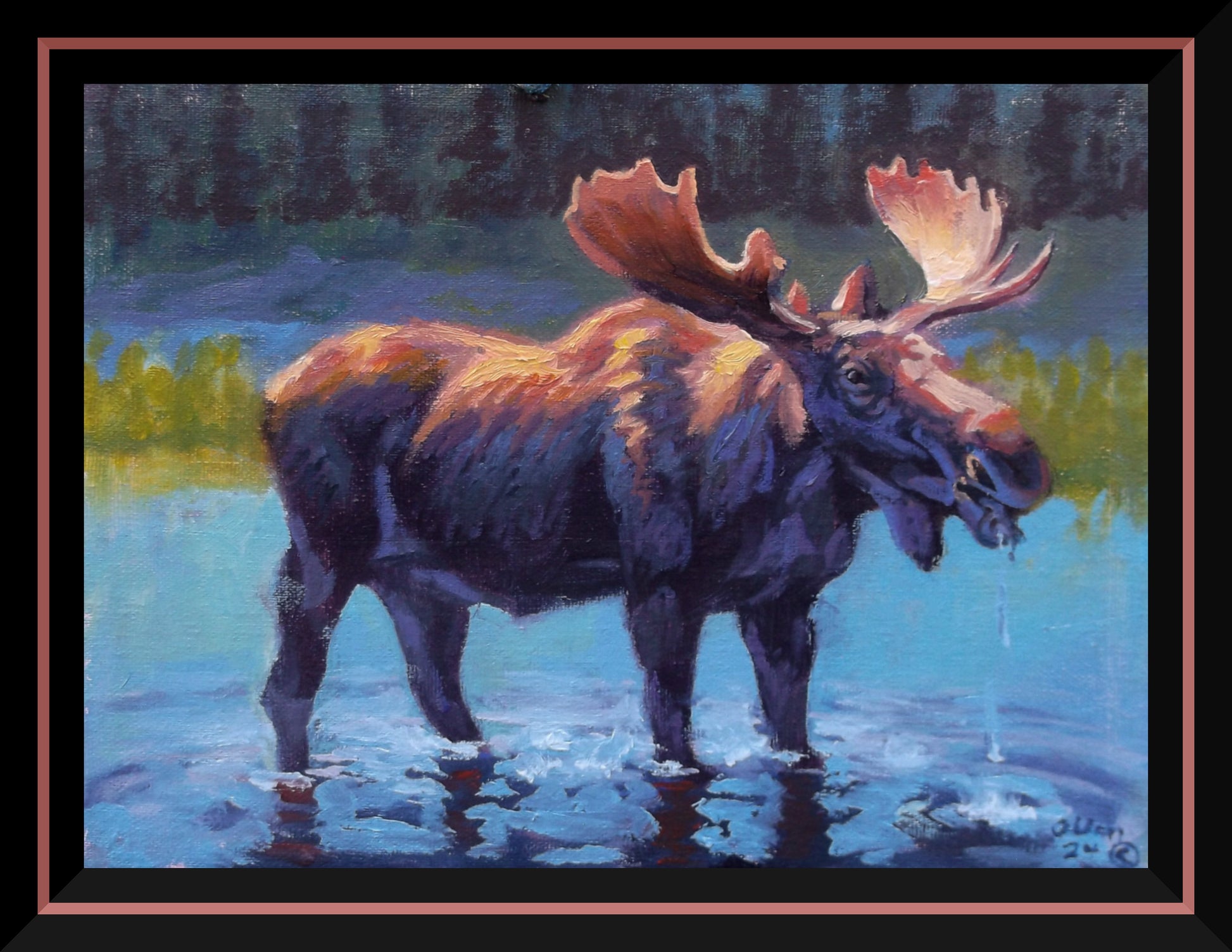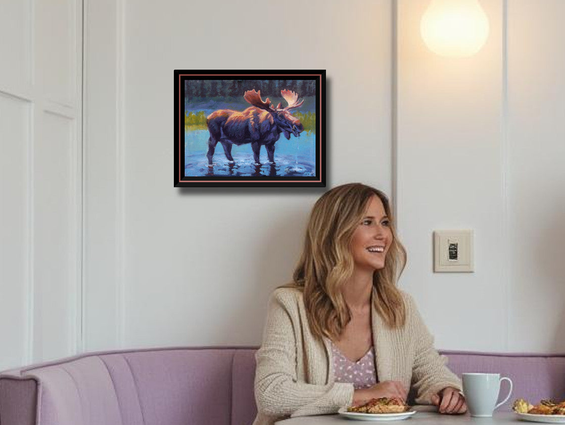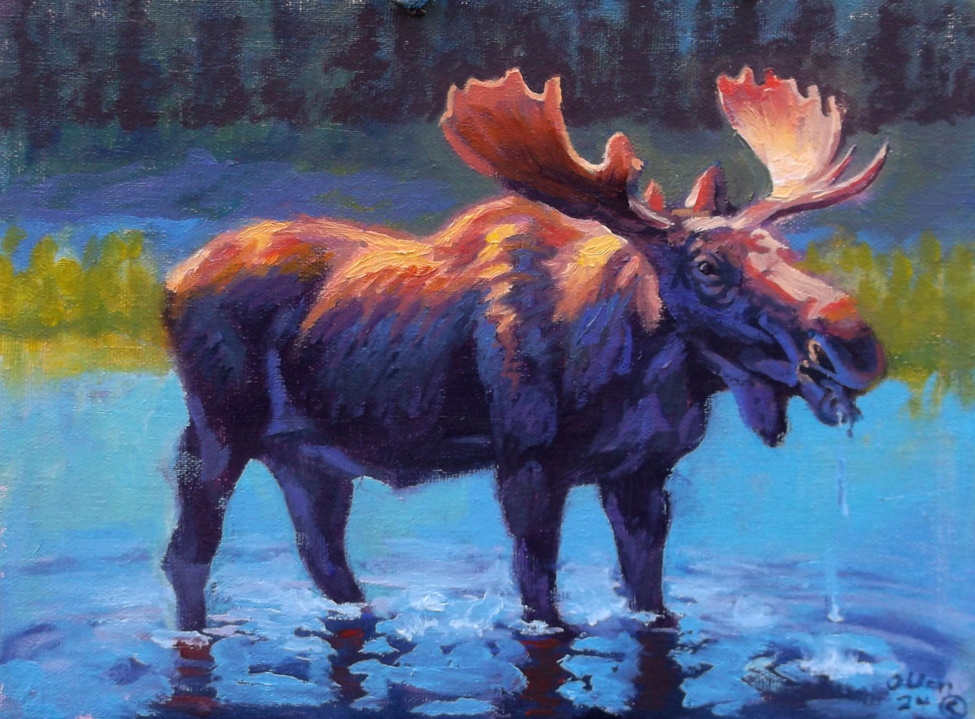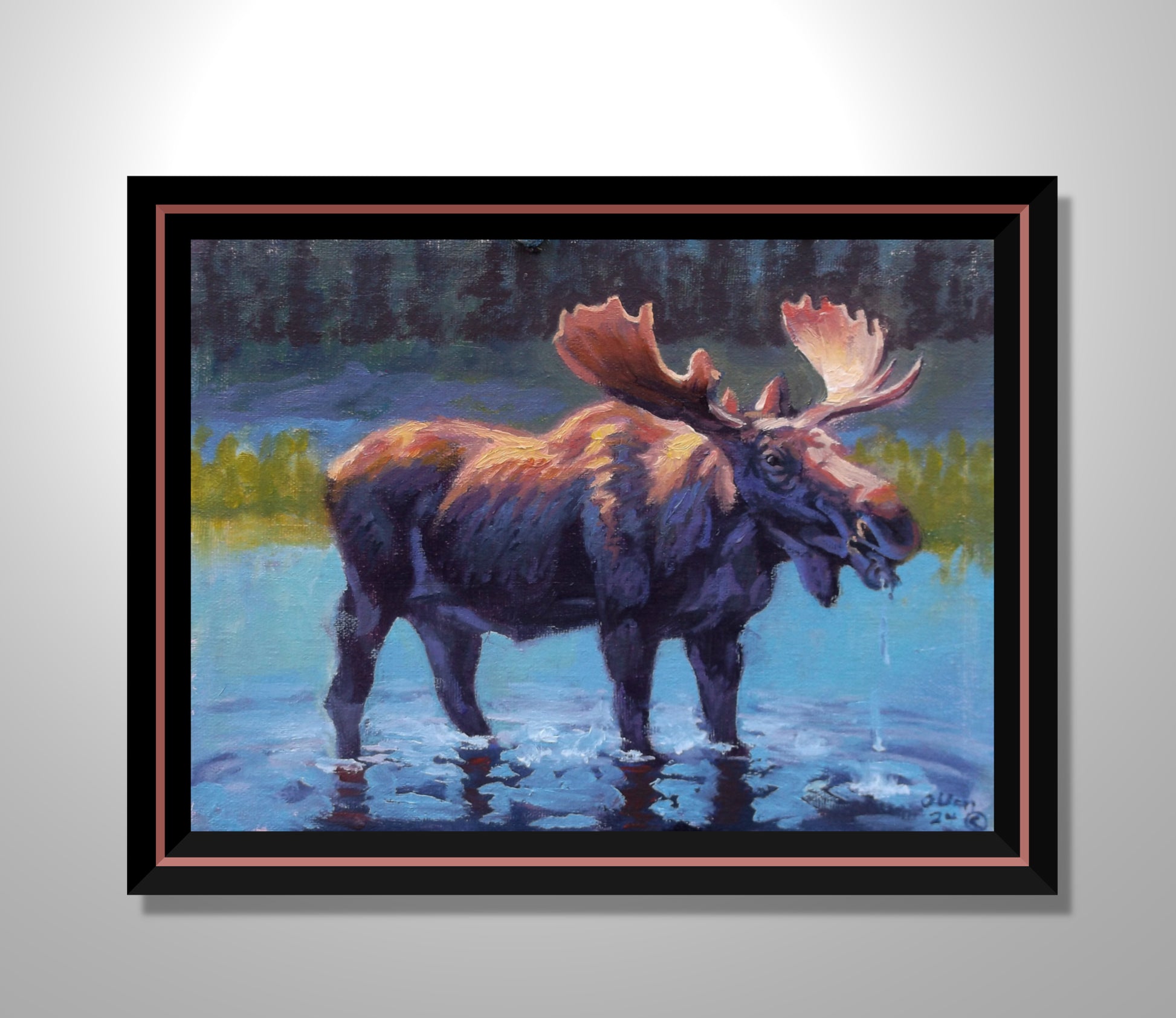 #oiloncanvas #wildlifeart #moosepainting #texturedbrushwork #twilighttones #natureinspired #serenelandscape #animalportrait #contemporarypainting #colorplay #reflectivewaters #peacefulmoments #pleinairstyle
