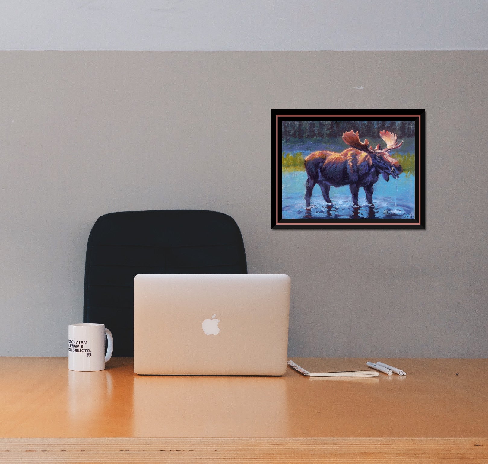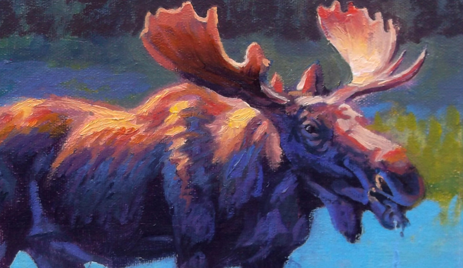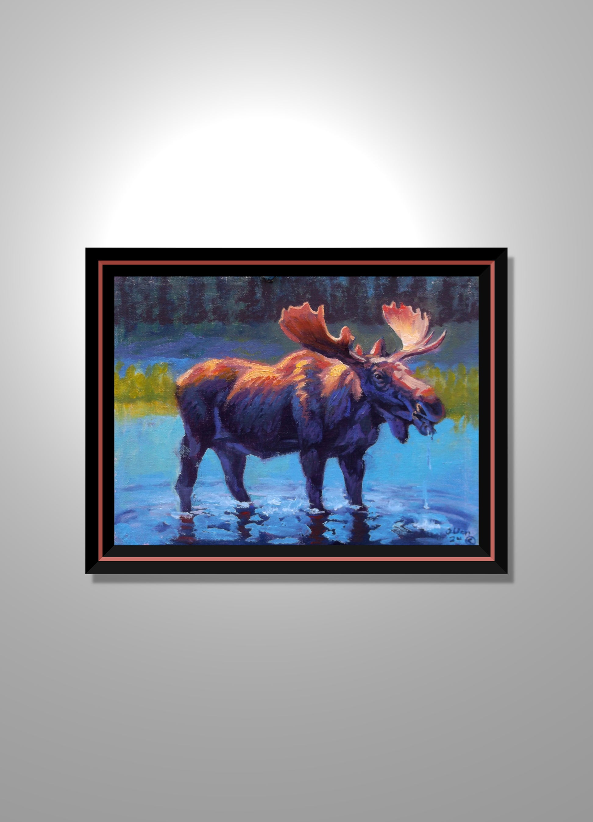 #oiloncanvas #wildlifeart #moosepainting #texturedbrushwork #twilighttones #natureinspired #serenelandscape #animalportrait #contemporarypainting #colorplay #reflectivewaters #peacefulmoments #pleinairstyle