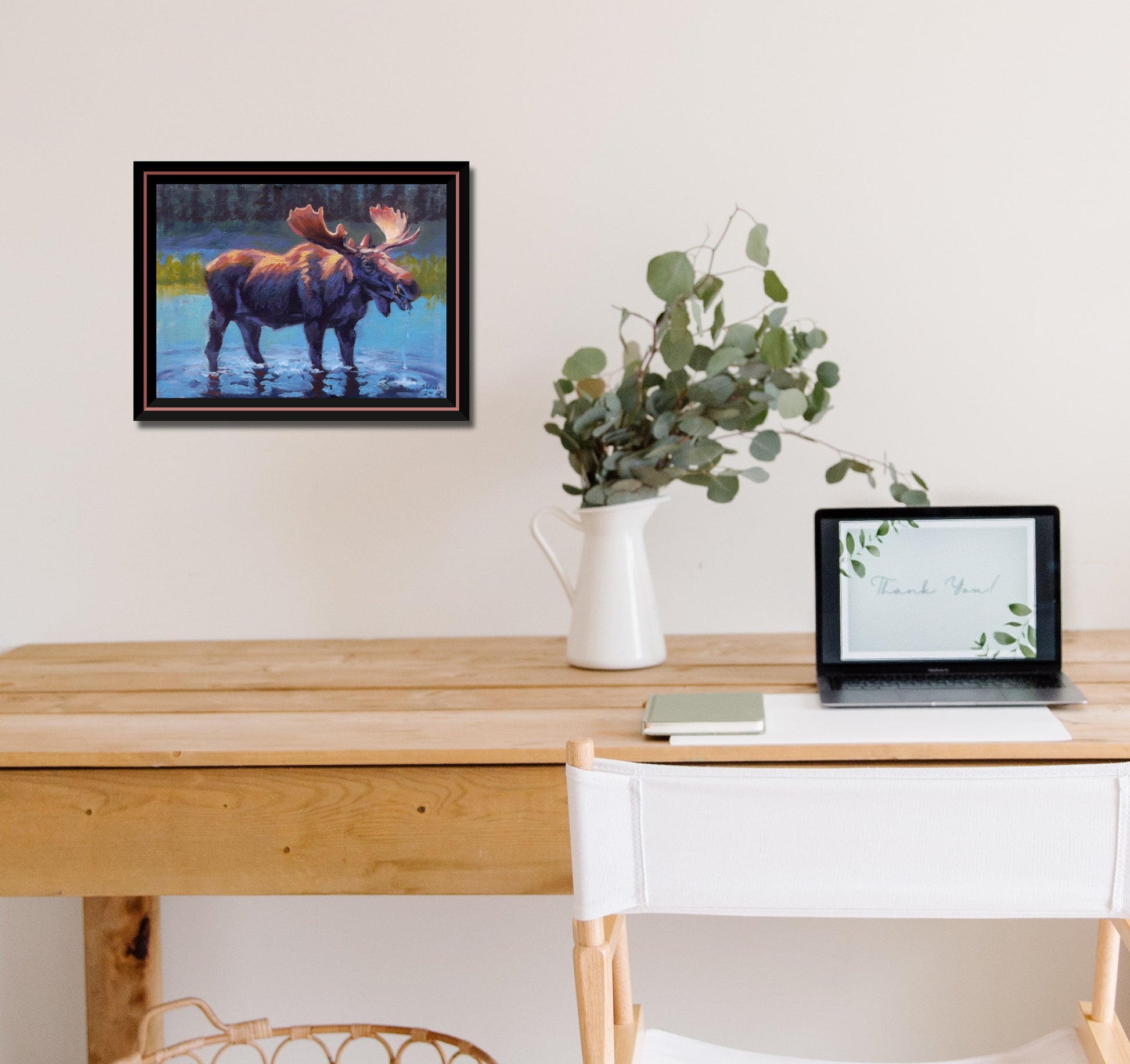 Twilight Quench captures a peaceful moment where nature takes a soothing breath. A moose, awash in dreamy blues and purples tinged with warm orange and yellow highlights, stands gracefully in shallow water, gently sipping as droplets trickle from its mouth. The calm water mirrors the animal’s vibrant hues and the subtle glow of the twilight sky, weaving together a delicate reflection of the scene’s quiet magic. Behind, a shadowy forest hums softly with hints of green and gold, setting a serene stage for this gentle wildlife encounter. The textured brushwork adds an inviting liveliness to the composition, as if the scene might ripple and breathe at any moment, inviting viewers into a tranquil pause between day and night.