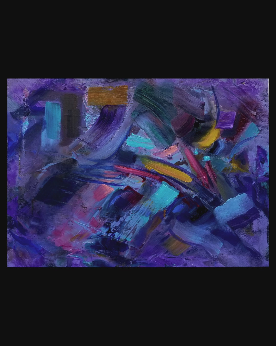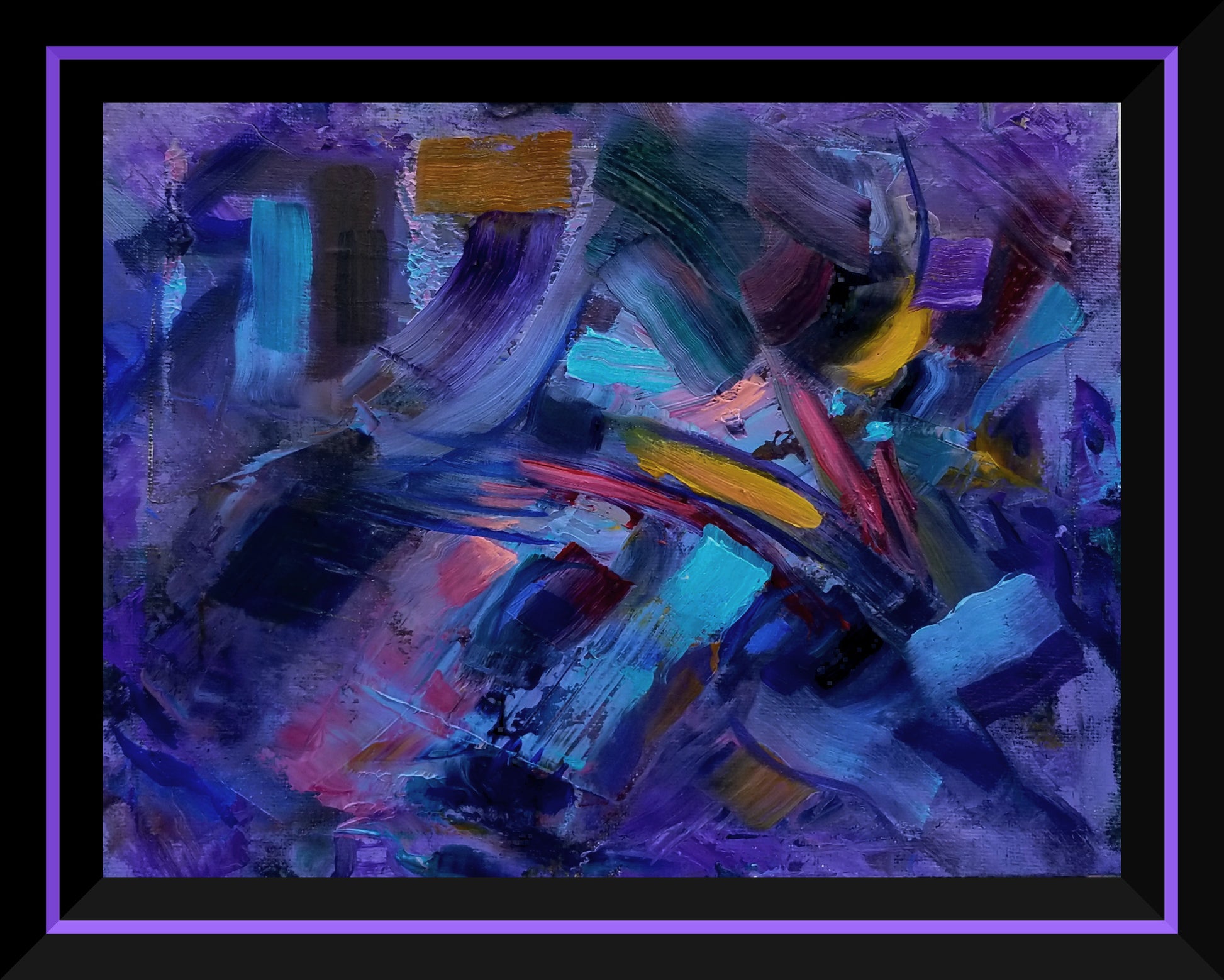 In “Violet Current,” I have sought to capture a flow that pulses beneath the surface—a restless energy woven from waves of purple and blue, shifting and merging like a hidden stream of light and motion. The thick, hurried brushstrokes carry an urgency, as if the colors themselves are in conversation, moving between calm and intensity with fluid grace. Flecks of warm yellows and reds spark through the cool depths, reminding us that beneath even the quietest currents, there is a flicker of life and passion. Painted alla prima, this piece is a moment seized in one breath, a vivid dance of emotion and color caught before it slips away. Step into the current and feel its unseen pull.