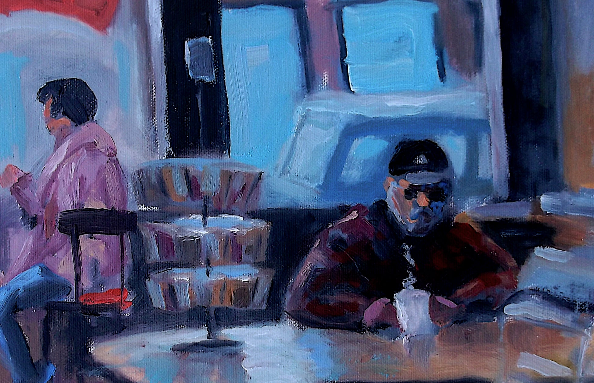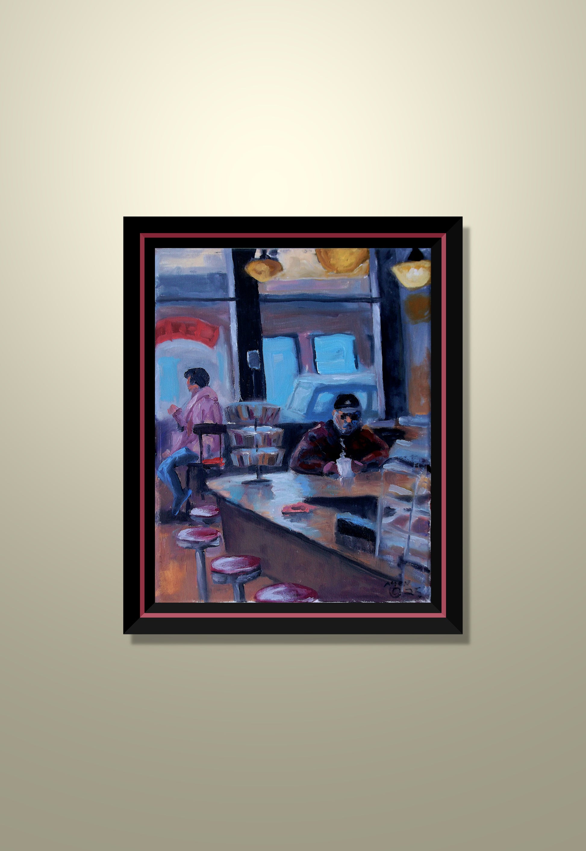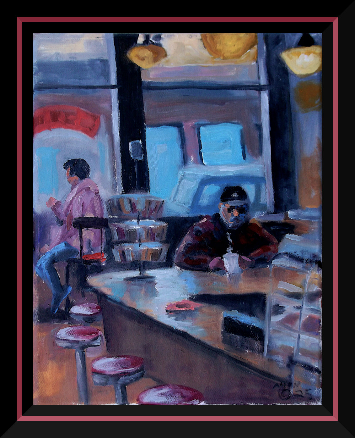 #oilpainting #interiorscene #dinerlife #impressionism #lightplay #counterculture #quietmoment #everydaybeauty #redstools #streetview #warmtones #artwithheart #contemporarycanvas